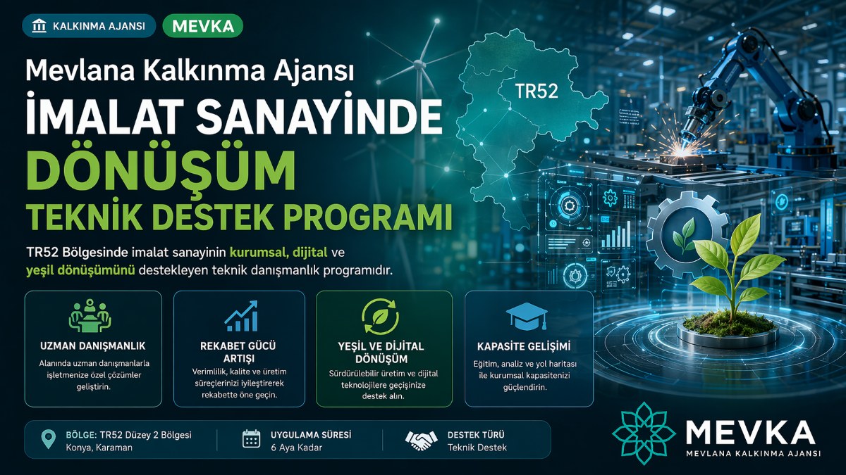 Bu program, TR52 Bölgesinde (Konya, Karaman) imalat sanayinde faaliyet gösteren işletmelerin kurumsal kapasitelerini artırmayı ve ikiz dönüşüm (dijital ve yeşil dönüşüm) süreçlerine uyum sağlamalarını desteklemektedir. Program kapsamında işletmelere danışmanlık, analiz, fizibilite ve eğitim hizmetleri sunularak; üretim süreçlerinin iyileştirilmesi, verimlilik artışı, teknoloji kullanımı ve sürdürülebilir üretim altyapısının geliştirilmesi hedeflenmektedir. Destek nakdi değil, Ajans tarafından sağlanan hizmet desteği şeklindedir ve faaliyet süresi en fazla 6 ay ile sınırlıdır.