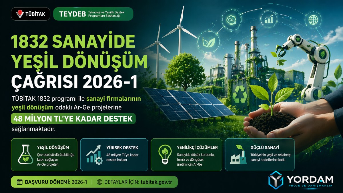 TÜBİTAK 1832 Sanayide Yeşil Dönüşüm Çağrısı, Türkiye’de faaliyet gösteren sanayi firmalarının çevresel sürdürülebilirlik odaklı Ar-Ge ve yenilik projelerini desteklemek amacıyla oluşturulmuştur. Program kapsamında; enerji verimliliği, su tasarrufu, karbon emisyonlarının azaltılması, döngüsel ekonomi uygulamaları ve temiz üretim teknolojileri gibi alanlarda geliştirilen projeler desteklenmektedir. Projelerin Ar-Ge niteliği taşıması, teknoloji hazırlık seviyesinin artırılması ve ticarileşme potansiyeline sahip olması beklenmektedir. Bu kapsamda projelerin başlangıçta en az THS 3 seviyesinde olması ve proje sonunda en az THS 7 seviyesine ulaşması gerekmektedir. Program, hibe ve geri ödemeli destek bileşenlerinden oluşan karma finansman modeli ile uygulanmaktadır. Proje bütçesi ve destek oranları işletme ölçeğine göre değişmekte olup, büyük ölçekli firmalar için %70, KOBİ’ler için %80 ve belirli bölgelerde %90’a kadar destek sağlanabilmektedir. Sanayide yeşil dönüşümü hızlandırmayı hedefleyen bu çağrı, firmaların uluslararası rekabet gücünü artırmayı ve sürdürülebilir üretim altyapısına geçişini desteklemektedir.